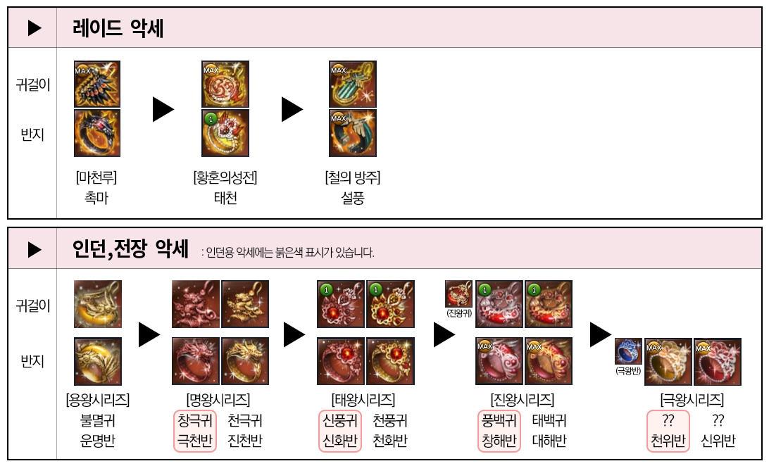 - 인던용 악세에는 붉은색 표시가 되어있습니다.