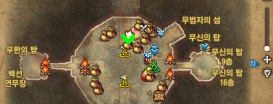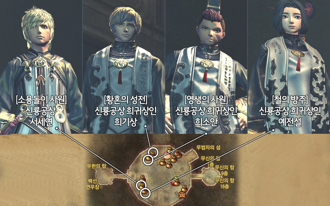 무신의 탑은 1인 던전, 각종 신룡공상 보따리 상인, 무한의 탑 등이 있어 유동인구가 많은 곳입니다.