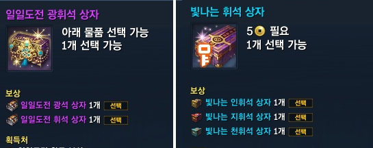+ 일일도전 광휘석 상자는 3도 완료 시, 빛나는 휘석상자는 번격삼선나폐.