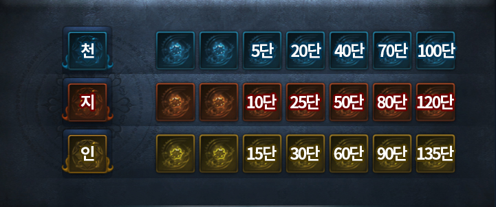 단 수에 따라 생명력/방어력/치명/공력/공격력등을 보정받을 수 있습니다.