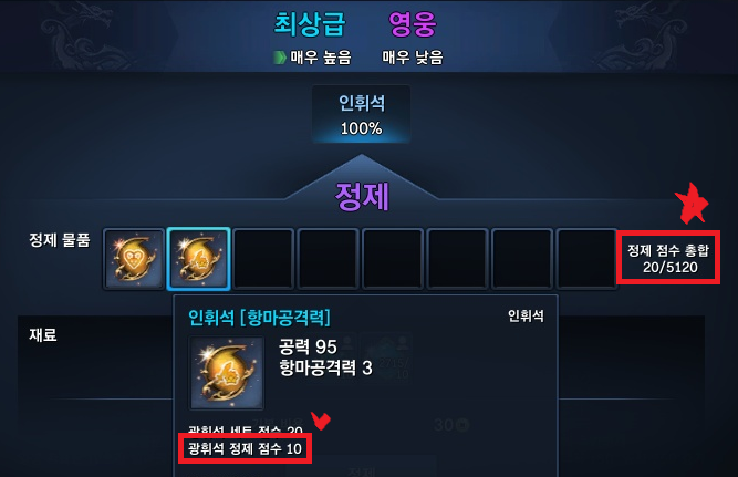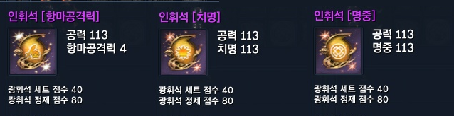 남는 영웅옵션의 광휘석들은 모아서 위의 조합식을 참고해 전설작~전설항마공작을 하시면 됩니다.