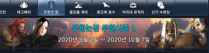 크게 비무|전장|신기수련장|챌린지|무한의 탑 으로 나눠지고 시즌시작일과 종료일은 모두 동일합니다.