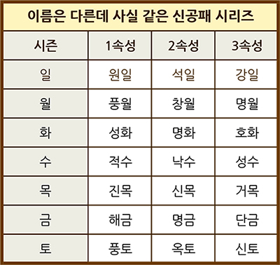 극초반에 나온 신공패나 전장용 신공패는 제외하고는 요일별 이름이 붙어있습니다.