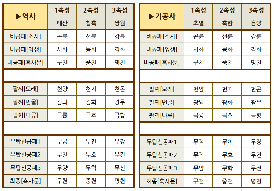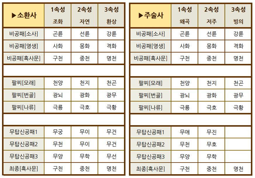 이 조합으로 나오는 신공패는 속성별로 1개씩, 총 3개가 나옵니다 (무양, 무학, 무선)