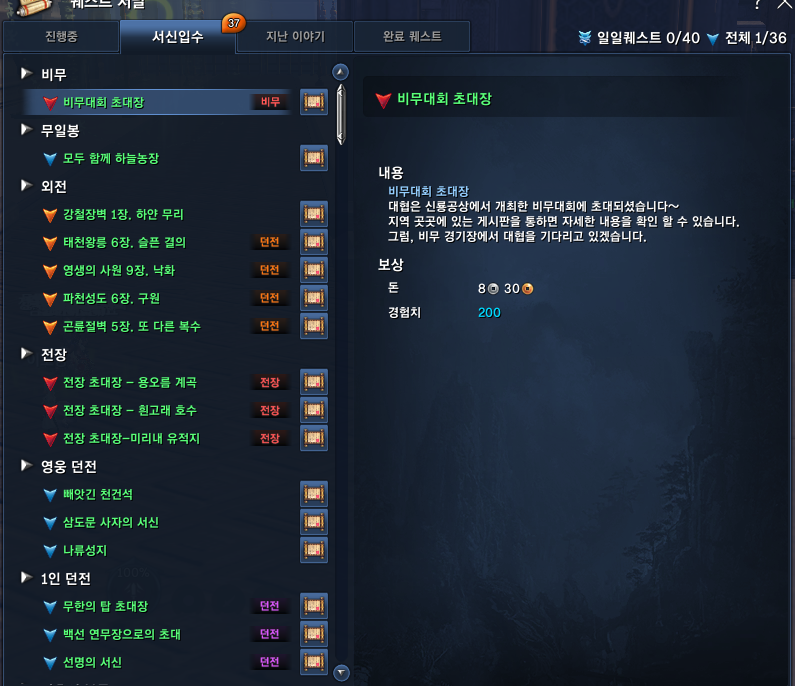 블소의 일일퀘스트(이하 일퀘)는 여러종류가 있습니다.